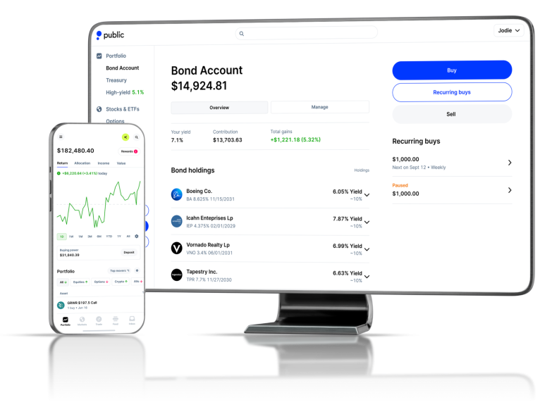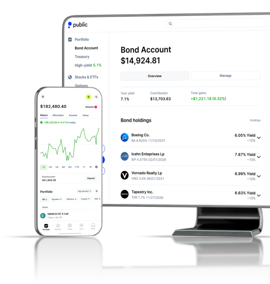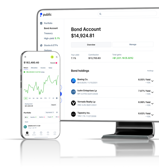 A Bond Account is a self-directed brokerage account with Public Investing, member FINRA/SIPC. Deposits into this account are used to purchase 10 fractional investment-grade and high-yield bonds in equal par value allocations. All bond investments are subject to risk, including risk of default. High-yield bonds carry greater risk of default than higher rated bonds. Learn more