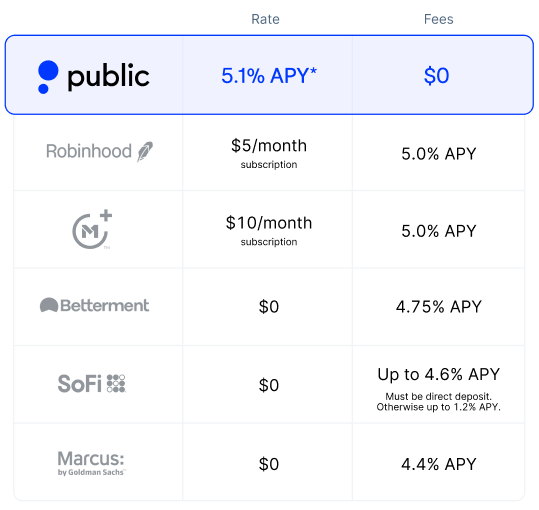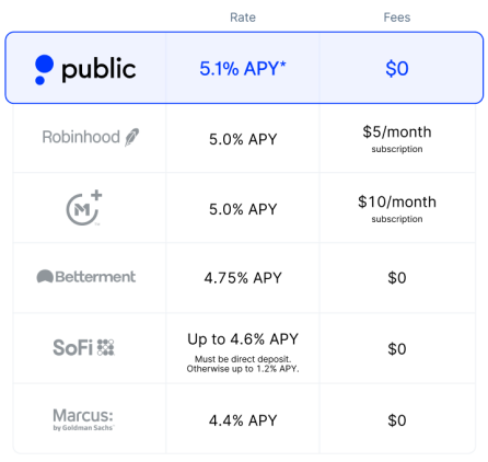 A High-Yield Cash Account is a secondary brokerage account with Public Investing. Funds in your High-Yield Cash Account are automatically deposited into partner banks (“Partner Banks”), where that cash earns interest and is eligible for FDIC insurance. See here for a list of current Partner Banks. Your Annual Percentage Yield is variable and may change at the discretion of the Partner Banks or Public Investing. Apex Clearing and Public Investing receive administrative fees for operating this program, which reduce the amount of interest paid on swept cash. Neither Public Investing nor any of its affiliates is a bank. Learn more.
