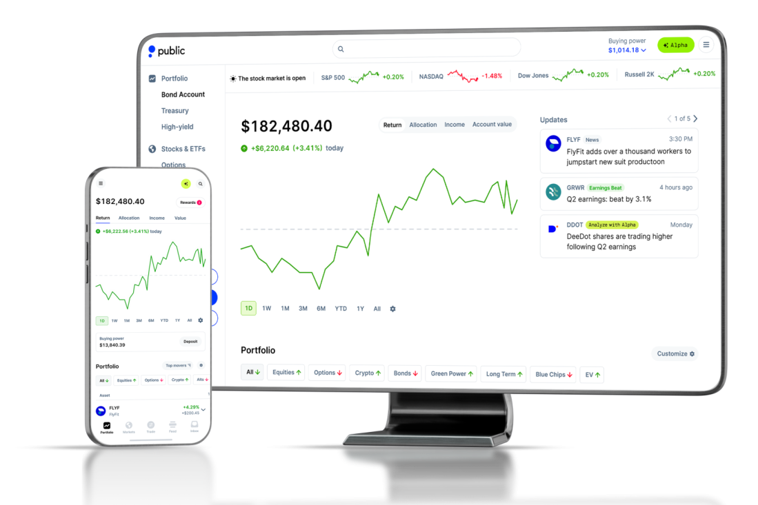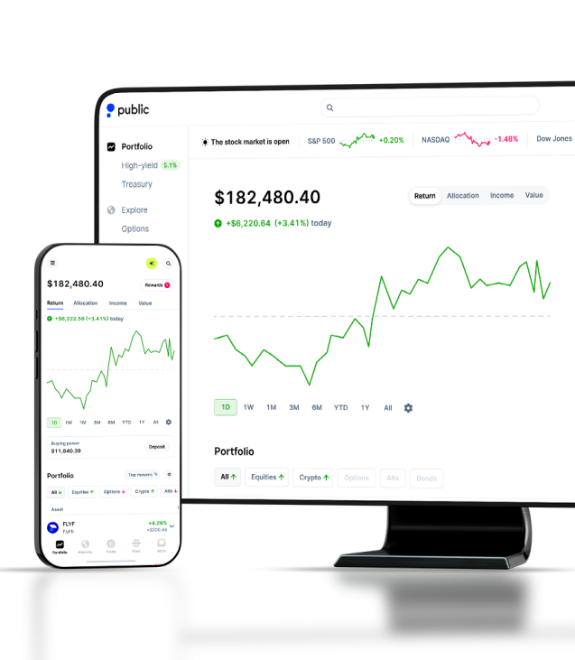 On Public, you can invest in stocks, options, bonds, crypto, ETFs, and more with AI-powered fundamental data and custom analysis. Plus, earn 5.6% yield** with our Bond Account, exclusively on Public.